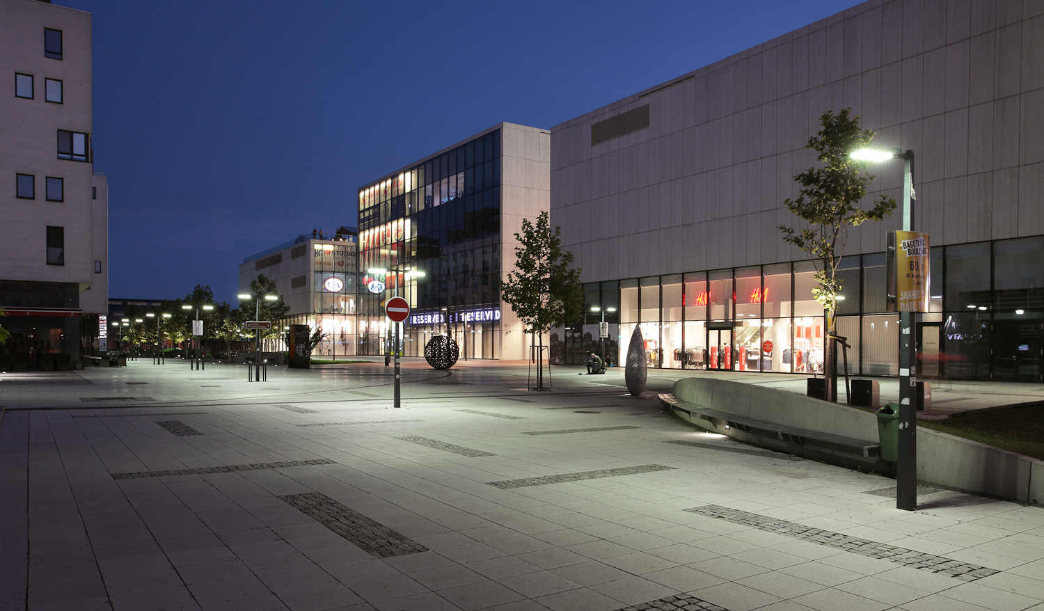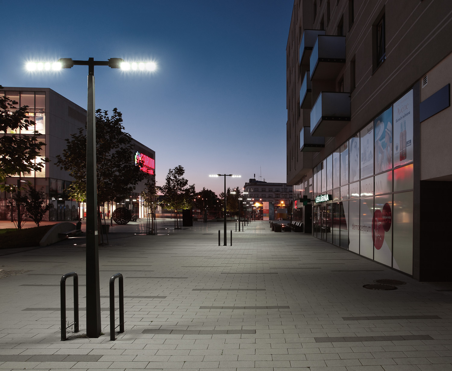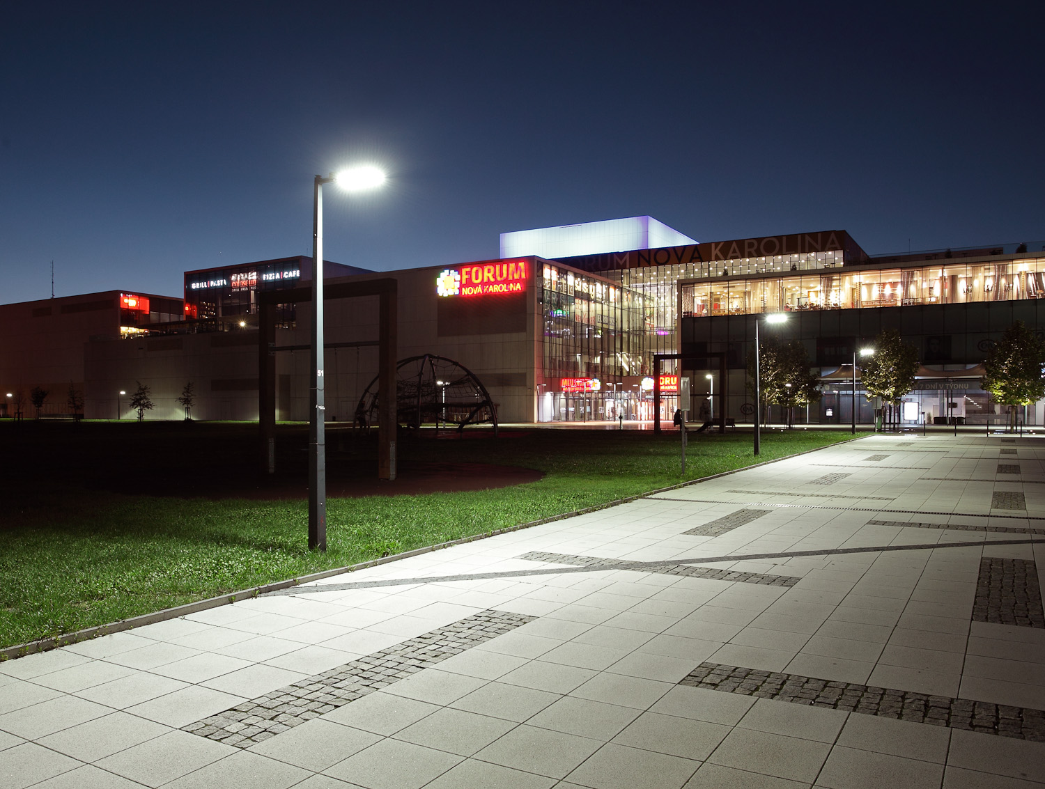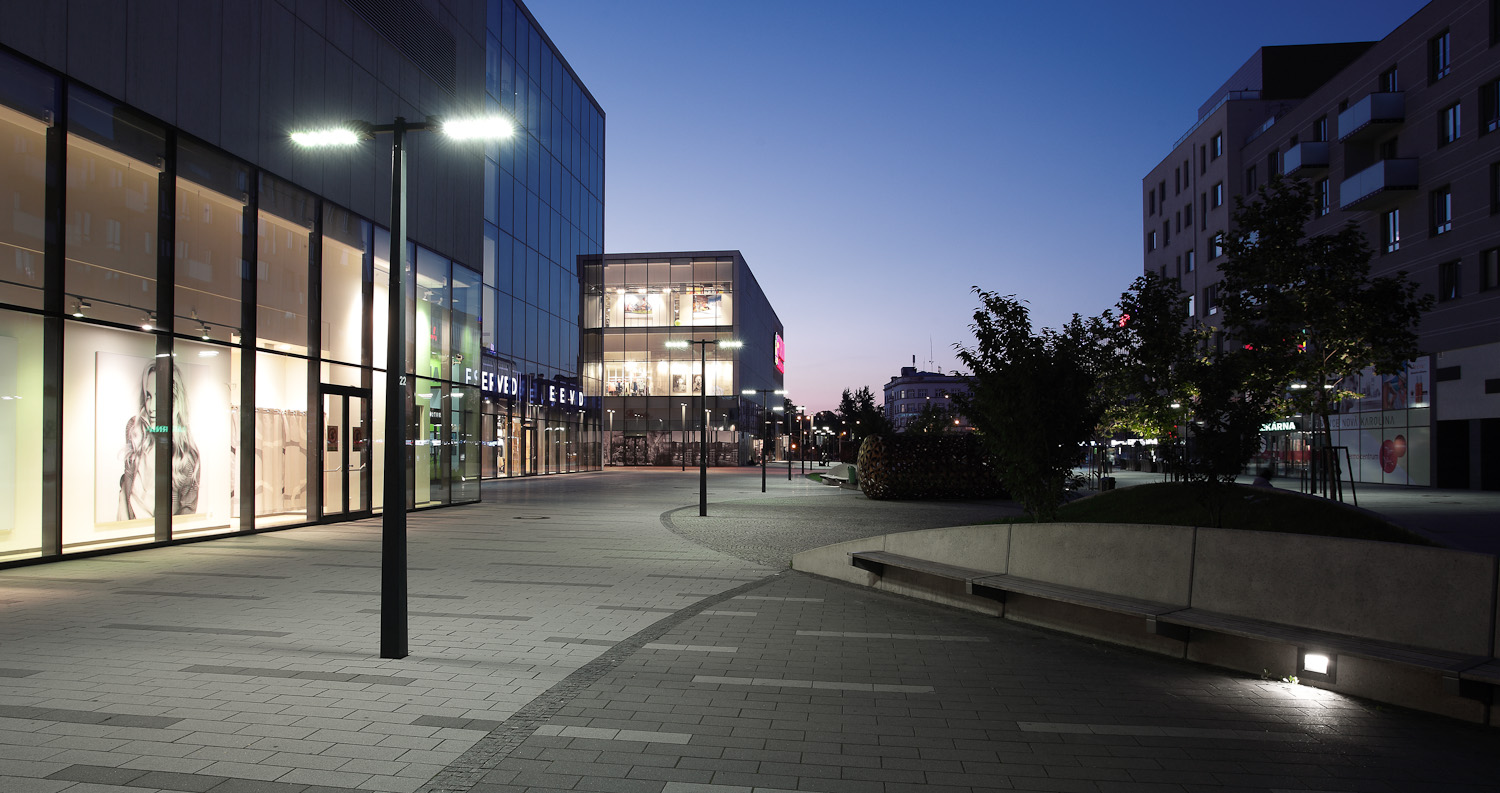 Technicky čistý design našich svítidel byl využit při osvětlení architektonicky zajímavé nákupní a odpočinkové zóny - Nová Karolina v Ostravě.
